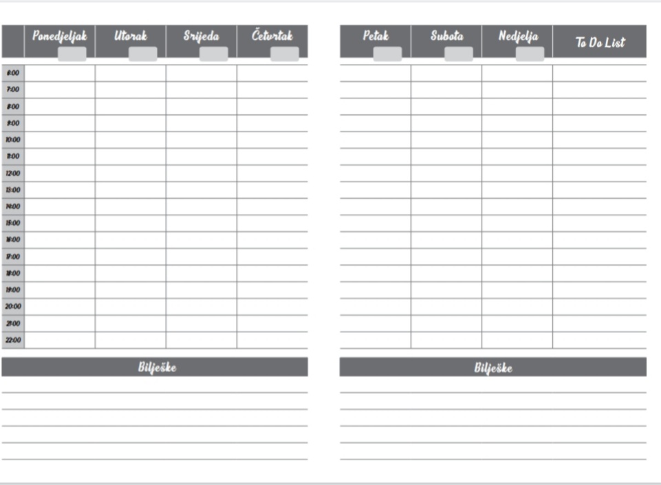 Prvi dio unutrašnjosti sastoji se od planera s danima i satima – BEZ DATUMA s predviđenim mjestom za upisivanje datuma. Drugi dio rokovnika sadrži prazne crte u koje možete zapisivati poslovne bilješke.